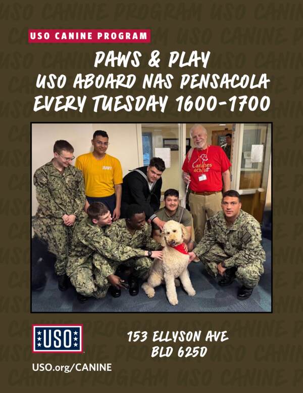 Come hang out with the canines! Tiana, Willow, Jax, Milly, Heidi, Panda, and Dottie are always happy to see our military service members and their families! New start time 4 pm to 5 pm at NAS Pensacola!