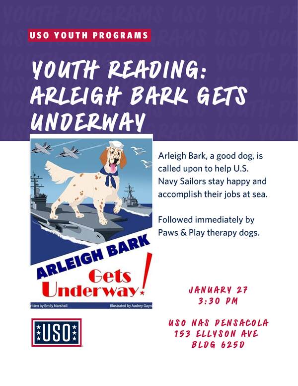 Arleigh Bark, a good dog, is called upon to help the U.S. Navy Sailors stay happy and accomplish their jobs at sea. Snacks, door prizes and youth activity included. Followed immediately by Paws & Play therapy dogs!